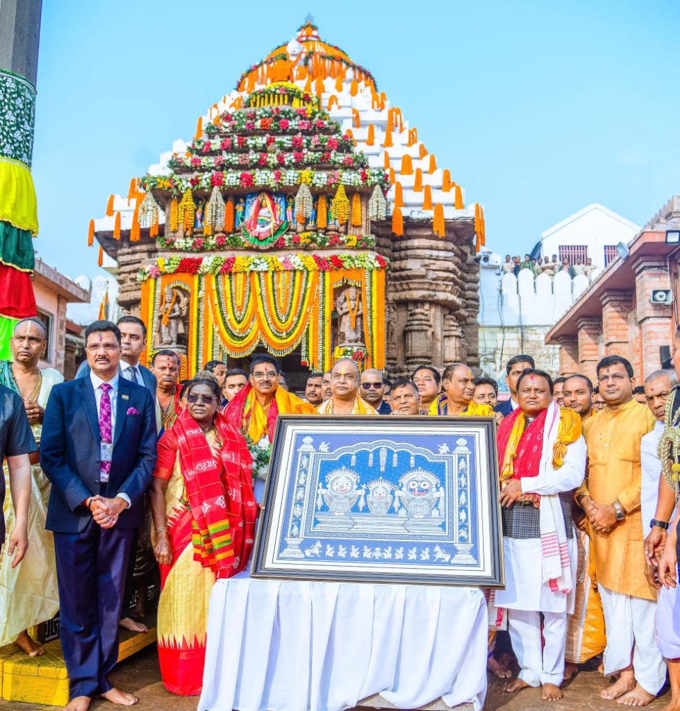 ପୁରୀ: ମହାମହିମ ରାଷ୍ଟ୍ରପତିଙ୍କୁ ଶ୍ରୀମନ୍ଦିର ପ୍ରଶାସନ ବିଦାୟ ଭେଟି ସ୍ୱରୂପ ପ୍ରଦାନ କରିଛି ସୁନାବେଶର ପଟ୍ଟଚିତ୍ର। ଶ୍ରୀମନ୍ଦିର ମୁଖ୍ୟ ପ୍ରଶାସକ ଡ. ଅରବିନ୍ଦ ପାଢୀ ଏହି ପଟ୍ଟଚିତ୍ର ପ୍ରଦାନ କରିଥିଲେ। ପୁରୀ ପଟ୍ଟଚିତ୍ର ସେଣ୍ଟରର ସ୍ୱନାମଧନ୍ୟ ପଟ୍ଟଚିତ୍ର ଗୁରୁ ପଙ୍କଜ ବେହେରା ଏହାକୁ ପ୍ରସ୍ତୁତ କରିଥିଲେ। ଏହି ପଟ୍ଟଚିତ୍ର ତିଆରି ସମ୍ପର୍କରେ ଗୁରୁ ପଙ୍କଜ କହିଛନ୍ତି, ମହାପ୍ରଭୁଙ୍କ ଦର୍ଶନ ପାଇଁ ଆସି ୫ ଜଣ ରାଷ୍ଟ୍ରପତି ତାଙ୍କ ଦ୍ୱାରା ନିର୍ମିତ ପଟ୍ଟଚିତ୍ର ଶ୍ରୀମନ୍ଦିର ପ୍ରଶାସନ ମାଧ୍ୟମରେ ଗ୍ରହଣ କରିଛନ୍ତି। ରାଷ୍ଟ୍ରପତି ହେବା ପରେ ପ୍ରଥମ କରି ମହାପ୍ରଭୁଙ୍କ ଦର୍ଶନ ପାଇଁ ଆସିଥିବା ବେଳେ ଦ୍ରୌପଦୀ ମୁର୍ମୁଙ୍କୁ ଶ୍ରୀମନ୍ଦିର ପ୍ରଶାସନ ଭେଟି ଦେଇଥିବା ବଡ଼ସିଂହାର ବେଶର ପଟ୍ଟଚିତ୍ର ମଧ୍ୟ ସେ ପ୍ରସ୍ତୁତ କରିଥିଲେ। ସୌଭାଗ୍ୟବଶତଃ ଚତୁର୍ଥ ପୁରୀ ଗସ୍ତରେ ବି ତାଙ୍କ ଦ୍ୱାରା ତିଆରି ମହାପ୍ରଭୁଙ୍କ ସୁନାବେଶର ଫଟ୍ଟଚିତ୍ର ଆଜି ସିଂହଦ୍ୱାରରେ ଗ୍ରହଣ କରିଛନ୍ତି ଭାରତର ପ୍ରଥମ ନାଗରିକ। ଏଥିରେ ପାରମ୍ପରିକ ପଟିରେ ଚତୁର୍ଦ୍ଧାବିଗ୍ରହଙ୍କ ଦୁର୍ଲ୍ଲଭ ସୁନାବେଶ ରହିଥିବାବେଳେ ଦଶାବତାର ମଧ୍ୟ ସ୍ଥାନ ପାଇଛନ୍ତି। କଳା ଧଳାରେ ଚିତ୍ରିତ ଏହି ଚିତ୍ର ବେଶ୍ ଆକର୍ଷଣୀୟ ହୋଇପାରିଛି।